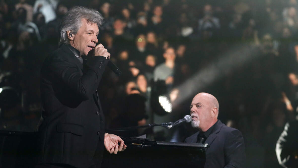 The pair of Rock and Roll Hall of Famers traded lines on both songs, with Joel at the piano and Bon Jovi roaming the front of the stage for each.